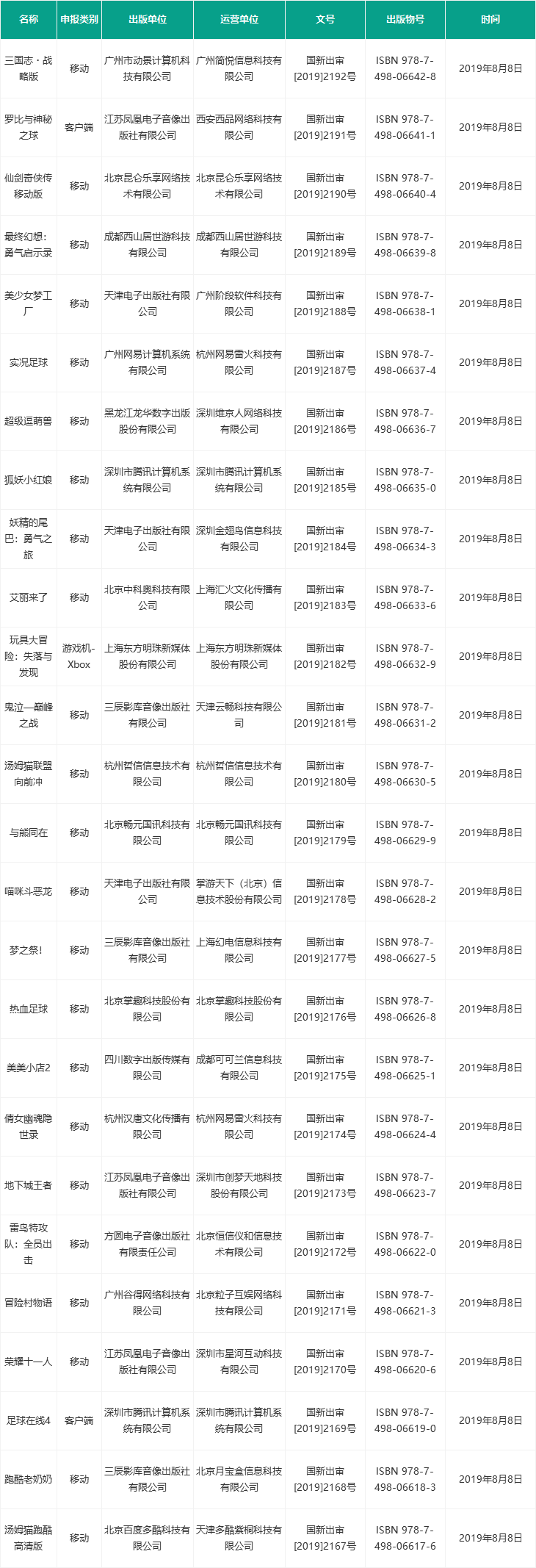过审游戏方面,包括腾讯《足球在线4(端游)》《狐妖小红娘》、网易《实况足球》《倩女幽魂隐世录》、西山居《最终幻想:勇气启示录》、UC&简悦《三国志·战略版》、B站《梦之祭!》、创梦天地《地下城王者》、昆仑《仙剑奇侠传移动版》、掌趣《热血足球》、百度多酷《汤姆猫跑酷高清版》、谷得网络《冒险村物语》、咸鱼游戏《荣耀十一人》、东方明珠《玩具大冒险:失落与发现(主机)》等。