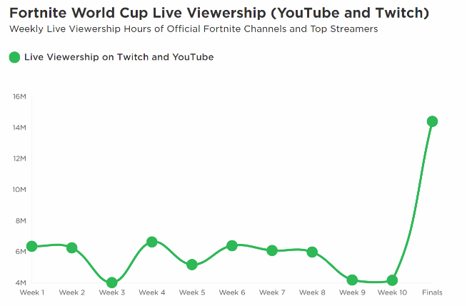 具体直播平台方面,此次决赛于7月26日至28日举行,仅在《堡垒之夜》的YouTube官方频道上就获得了560万小时的直播观看收视率,而其Twitch官方频道的收视时长也达到450万小时。