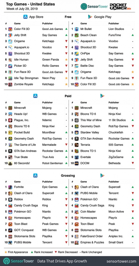 在Google Play平台,冠军宝座则由Lion Studios旗下的《Mr Bullet》夺得。而Say Games和Voodoo均有2款游戏入围该平台免费前十。