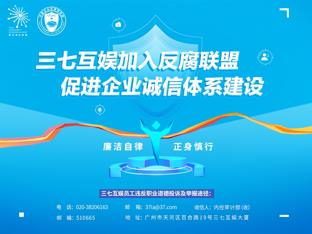 打造廉洁诚信、公平透明的社会环境,是企业制度建设和履行社会责任的必然要求。为建设良好的营商环境,促进企业健康发展,近日,三七互娱正式加入中国企业反舞弊联盟以及阳光诚信联盟,和联盟企业成员加强互动沟通,共同建设阳光透明的经营环境以及公正廉洁的商业环境,做好企业诚信体系建设工作。