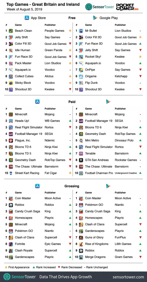 在本期的英国免费榜上,新游的表现尤为亮眼,共计有5款产品挤进App Store免费前十。这5款游戏分别是《Beach Clean》《Idle Human》《Pack Master》《Collect Cubes》以及《Sticky Block》,且均出自不同的厂商旗下。