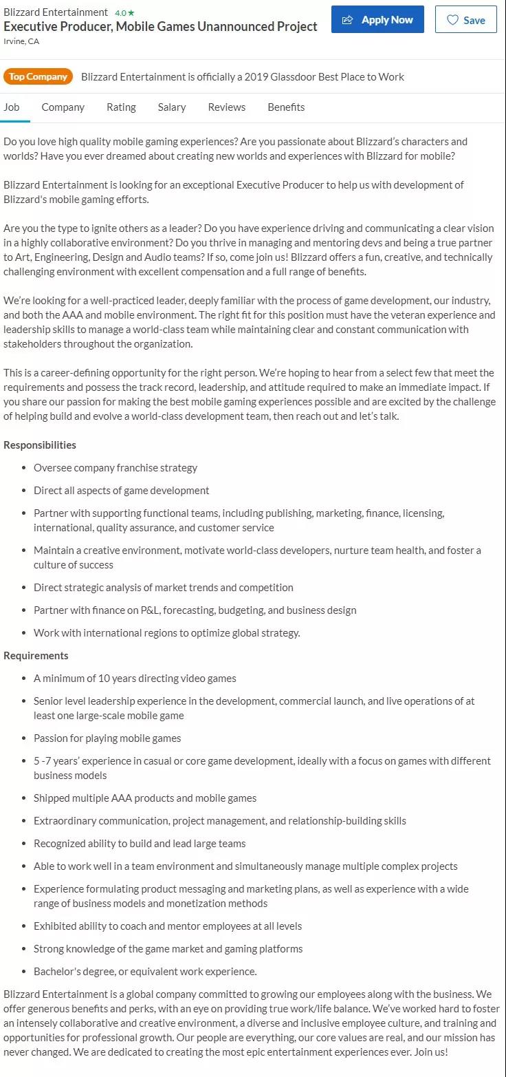 值得注意的是,手游项目的执行制作人的岗位职责要求颇高,需要有超过10年的游戏行业经验、对3A大作和手游开发都有所了解,能够把握游戏市场和不同平台,以及“对玩手游充满热情(Passion for playing mobile games)”。