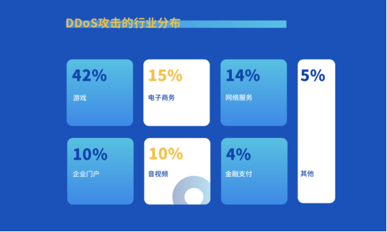 由于游戏行业流水量大、变现速度快,当仁不让的成为了DDoS的攻击目标,2019年上半年遭受DDoS攻击的行业中,游戏行业占到42%,电商、网络服务、企业门户、音视频等紧随其后。在游戏行业的细分占比中,手游占比高达45%。作为出海的主力军,游戏企业不断扩展海外业务。海外DDoS攻击同样很猖獗,企业基本都面临着海外自建DDoS防护成本高、建设周期不可控、溯源难上加难等问题。