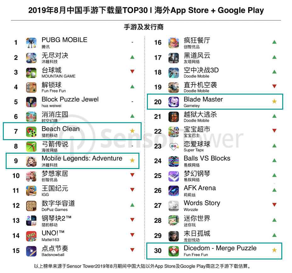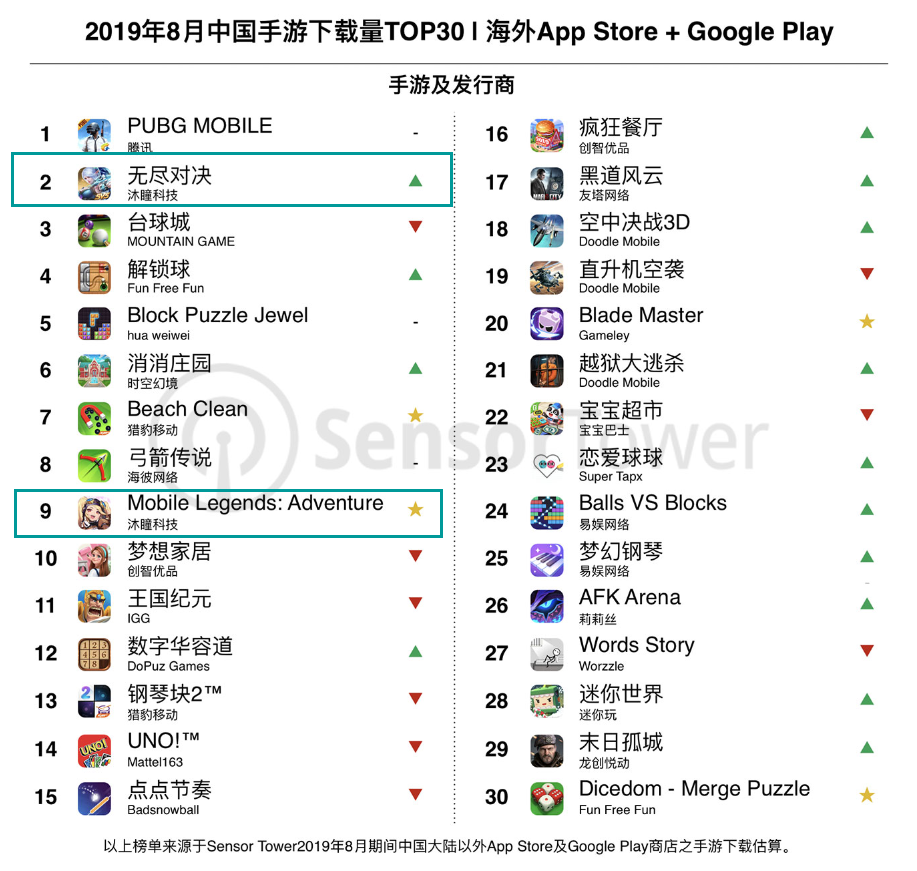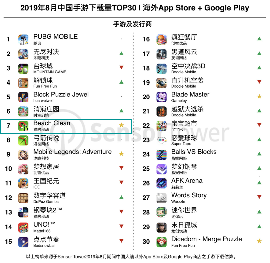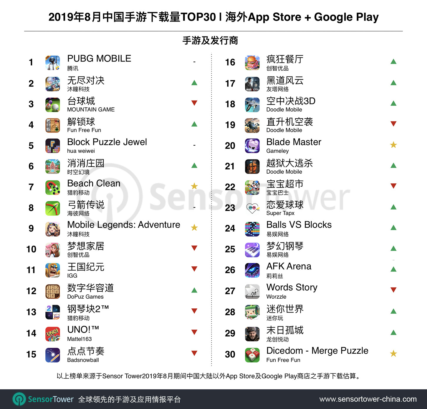 今天(9月19日),数据分析公司SensorTower发布了2019年8月中国游戏出海报告,报告揭示了8月中国手游在海外的下载量TOP30。