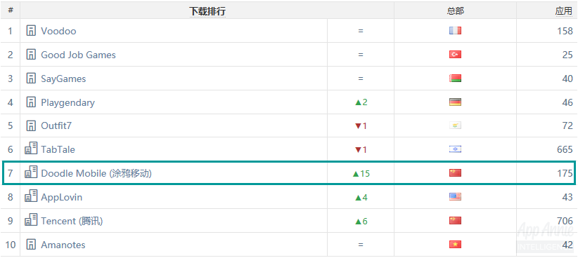 从近两个月的下载量榜单来看,涂鸦移动这家轻游戏“爆款制造机”在今年又回到了市场头部位置。在7月份的iOS & Google Play全球游戏下载量公司排名上,涂鸦移动排名上升15位拿下了第7名。