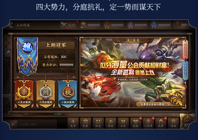 上兵伐谋,大杀四方。《三国杀十周年》在周年庆之际,上线了“上兵伐谋”公会势力战玩法。全新的版本更重社交,玩家加入公会绑定一方势力,便能与所在的公会成员一起攻城略地、瓜分奖池。总奖池、势力奖池、公会奖池,丰厚赛季结算奖励供强者夺取。