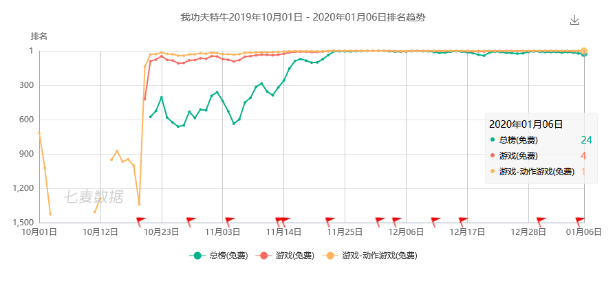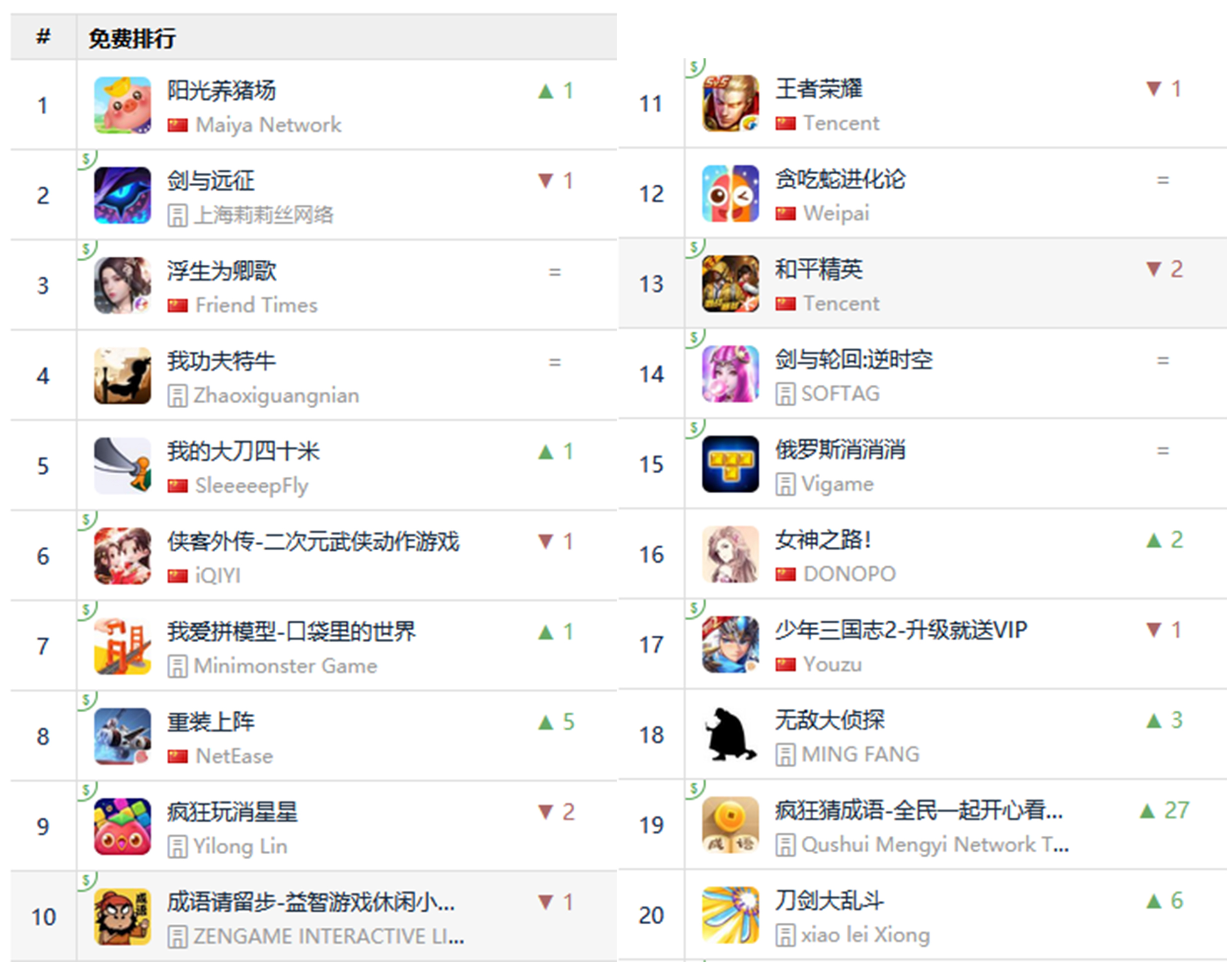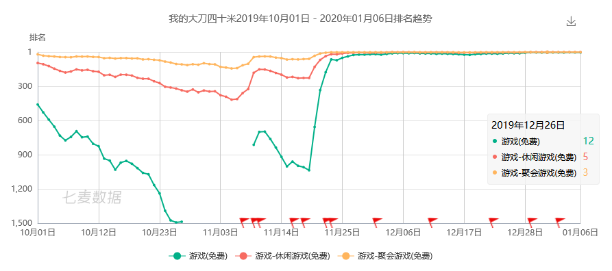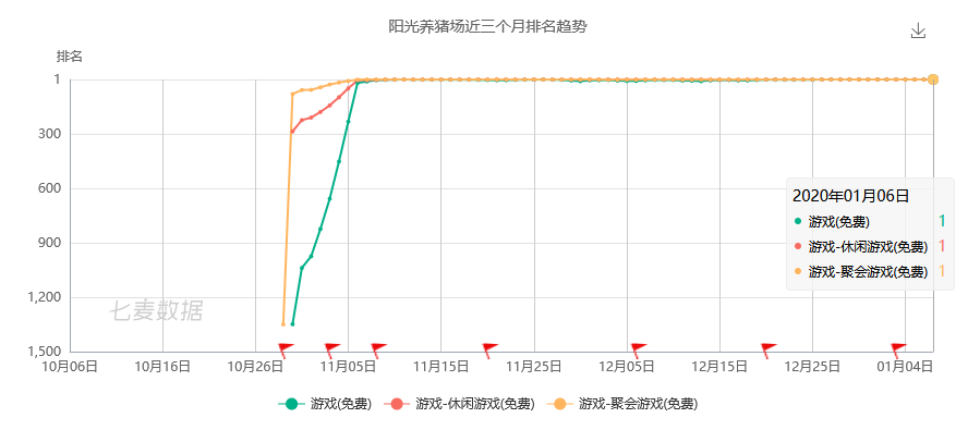 免费榜近期最大的变化,莫过于流量产品的集体回潮。靠着买量手段一路高歌猛进的《阳光养猪场》在年底重新回到免费榜前三的位置,而2019年大年初一爆红的《我飞刀玩得贼6》厂商新产品《我的大刀四十米》在2019年9月底推出后沉寂了许久,同样在年底开始发力,目前已经进入Top5的高位。
