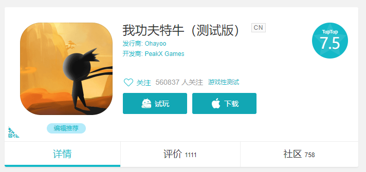 情况类似的还有整合了roguelike玩法的《我功夫特牛》,这款同时有着流量优势和玩法口碑的作品即使放在玩家群体核心向的TapTap平台也有着7.5分的不错评价,算是众多流量产品中的一股清流,本作年初的成绩依旧不俗,同样排在前五的位置。