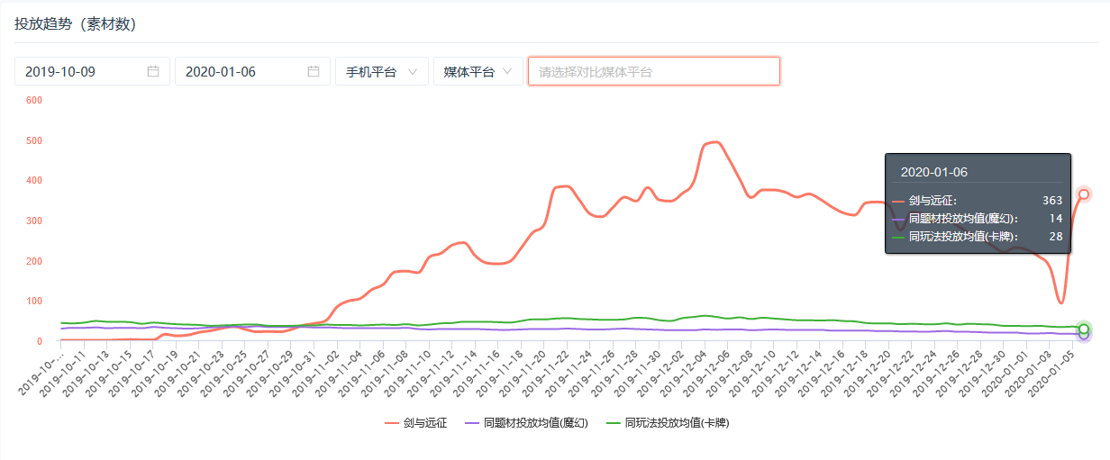 可以用“刷屏”形容其投放力度的《少年三国志2》,上线日较早但仍有着国内前三的广告投放量。而其他大厂出品如《神武4》《梦幻西游三维版》《三国志战略版》等,也都没有放松各自的投放力度,产品持续留存在畅销榜单高位。