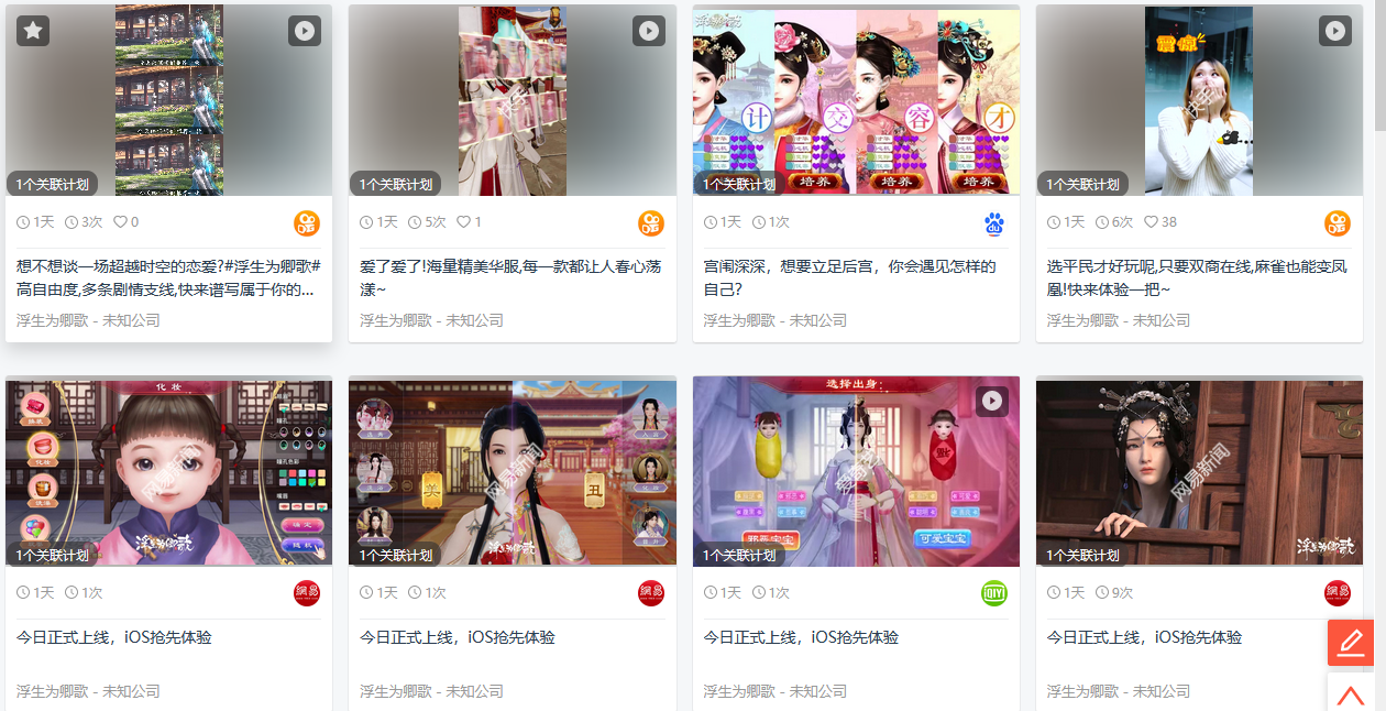 玩友时代发行的《浮生为卿歌》同样不落下风,虽然作为一款MMORPG本作有着一定的受众门槛,但在今日头条为首的媒体平台投放的大量视频广告为它带来了较高的曝光度。