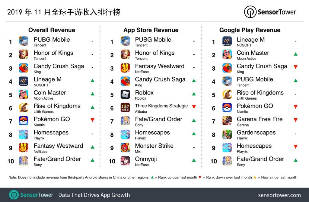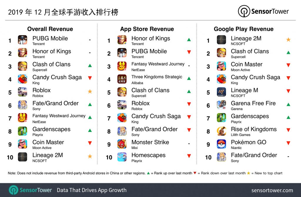 根据2019年12月全球手游收入排行榜,来自腾讯的《王者荣耀》紧随《PUBG Mobile》是2019年12月全球收入第二高的手机游戏,总收入接近1.39亿美元,较2018年12月同比增长5%。《王者荣耀》的收入约94%为来自中国,其次是泰国,占2%。接下来最卖座的手机游戏是Supercell的《部落冲突》,其次是King的老牌三消《Candy Crush Saga》和Roblox的同名游戏《Roblox》。