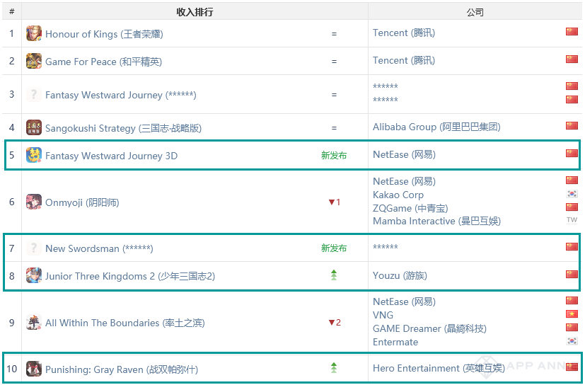 4款新上榜游戏分别是网易《梦幻西游3D》、完美世界《新笑傲江湖》、游族网络《少年三国志2》及英雄互娱《战双帕弥什》。其中,得益于上榜新游的收入带动,在iOS中国游戏公司收入榜上,游族网络和英雄互娱排名蹿升并双双进入TOP10。