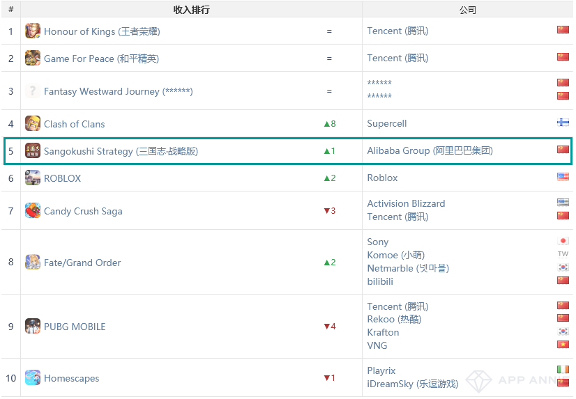 《三国志·战略版》的增长势头持续向好。App Annie数据显示,虽然《三国志·战略版》在iOS中国游戏收入榜上的成绩依旧稳定在前四,但其在iOS全球收入榜上升了一位,跻身TOP5行列。