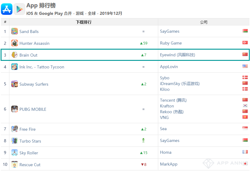 一、风眼科技《Brain Out》拿下全球下载榜第三,国产超休闲持续发力