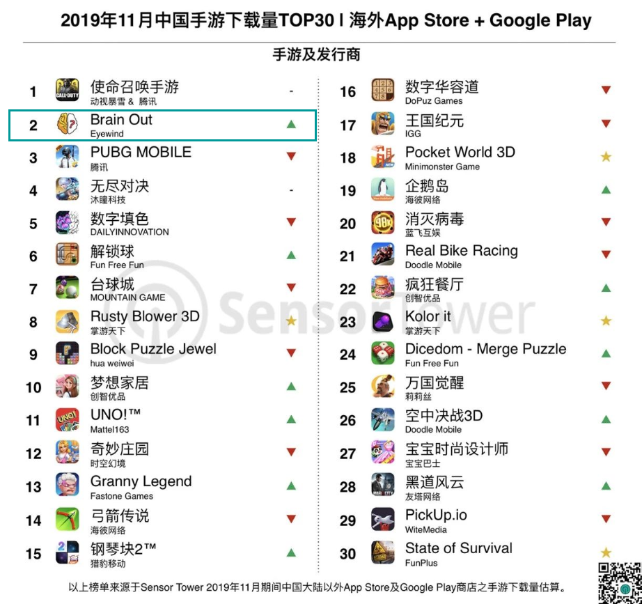在此前SensorTower发布的11月手游出海下载量TOP30榜单中,《Brain Out》也挤下《PUBG Mobile》拿下了第2名的位置。据了解,这款益智解谜类游戏自10月上线,便在App Store和Google Play持续获得推荐,配合风眼科技的买量投放,实现了下载量持续增长,曾拿下124个市场的iOS游戏免费榜TOP1。