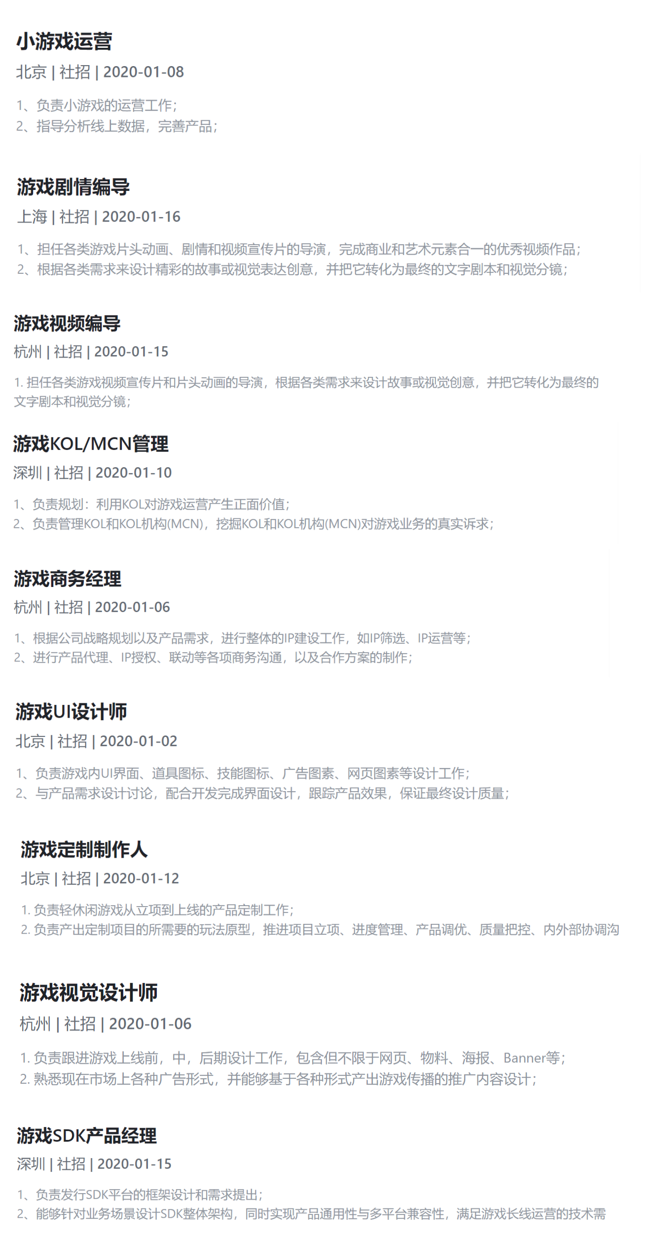 当然,字节跳动为进攻游戏业务而招兵买马的决心早就在2018年便露出苗头。根据字节跳动招聘官网的最新消息显示,目前游戏在招相关职位共有324个。公司近日更发布了一批新的岗位招聘信息,涵盖小游戏运营、剧情编导、UI设计等职位。此外,字节跳动目前还在招聘海外发行和营销人员,新的一年里其游戏业务全球化的步伐或进一步加快。