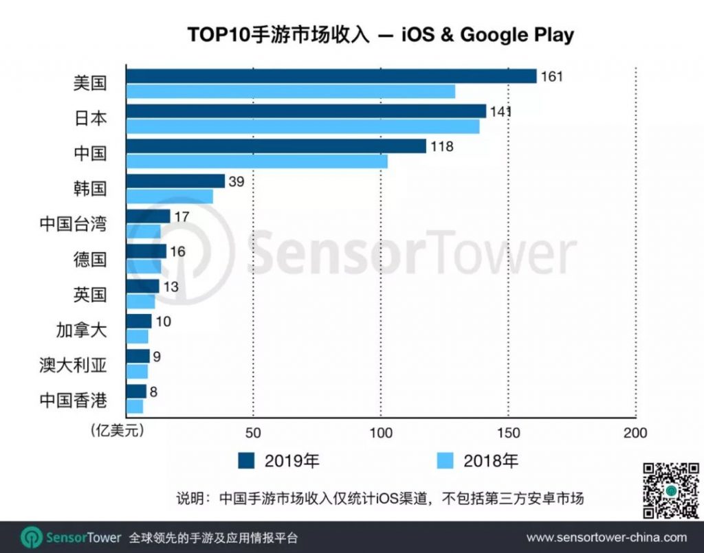2019年,美国手游市场的收入超越日本,成为除中国以外,收入最高,增长最快的市场。
