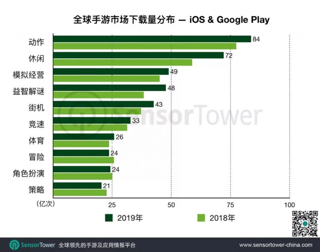下载量方面,虽然过去2年超休闲游戏在数量上统治全球手游下载榜头部,但在《PUBG MOBILE》,《Garena Free Fire》,《使命召唤手游》,《地铁跑酷》等商业大作的带领下,动作类仍是下载量最多的品类。