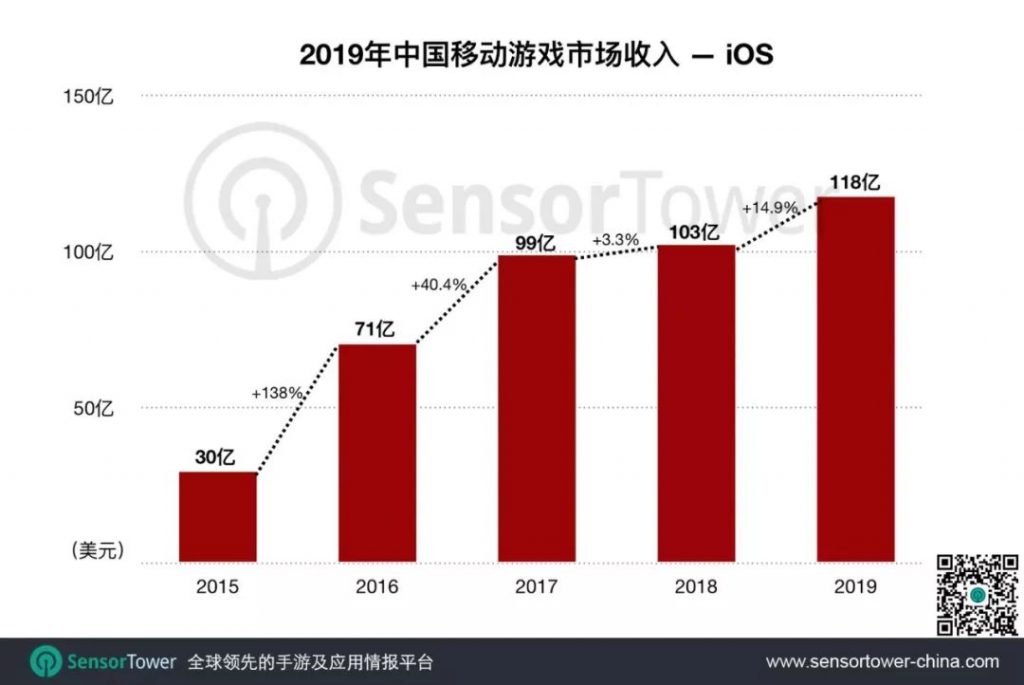 经过2018年的行业调整之后,中国手游市场在2019年再次步入上升通道。国区iOS手游收入达到118亿美元,较去年增长14.9%。增幅前五的游戏依次为网易《率土之滨》,三七互娱《一刀传世》,腾讯《红警OL》,网易《阴阳师》和炎魂《忍者必须死3》。
