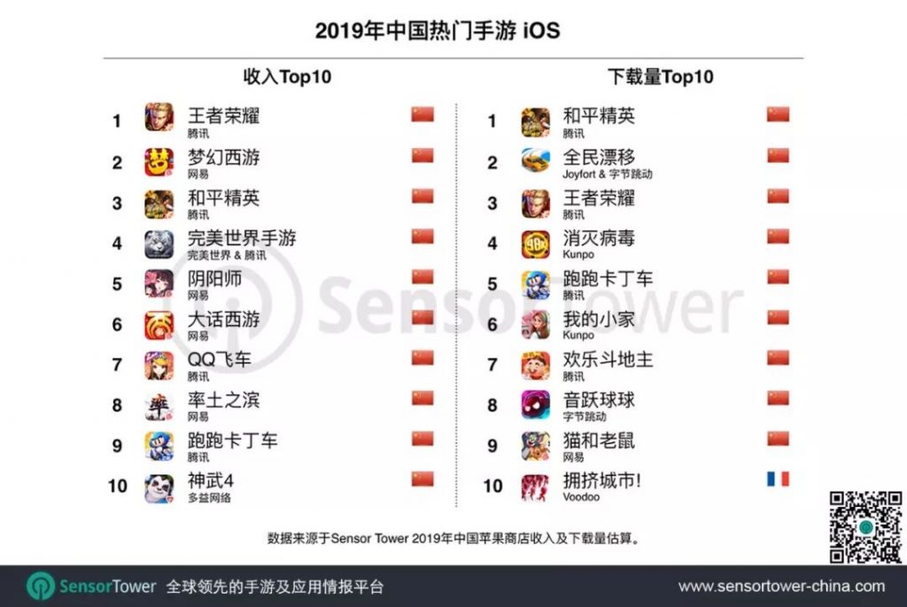 2019年,腾讯两款手游包揽全球手游畅销榜第1和第2名。其中,《王者荣耀》及海外版本全球预估收入超过14.8亿美元,已连续两年获得全球手游收入冠军。