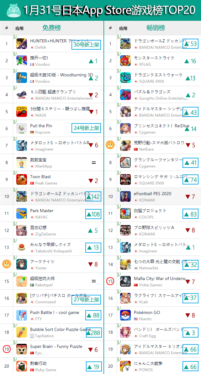 免费榜方面,《明日方舟》以及《Super Brain》继续稳守免费榜;畅销榜方面,则是仅剩下《荒野行动》以及《黑道风云》两个“常青树”仍然坚守在日本畅销榜头部。