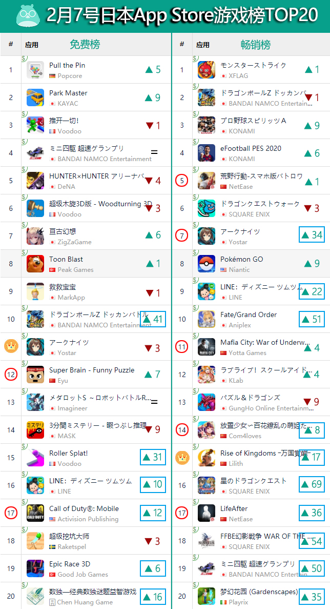 在免费榜方面,本期打入日本市场免费榜头部的3款作品都是我们栏目的老熟人。《明日方舟》在本期继续稳守TOP11,另外两款早前曾经上过我们栏目的产品《Super Brain》以及《使命召唤手游》也在本期顺利回归。