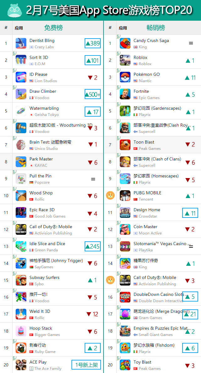 在畅销榜方面则仍然可以见到《PUBG MOBILE》和《使命召唤手游》分别拿下了TOP10和TOP15;不过除了这两款战术射击类的“老产品”之外,同样没有其他产品能成功打入美国畅销榜头部。