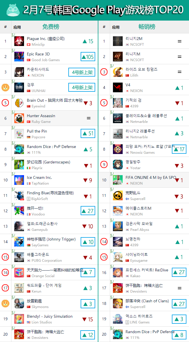 虽然本期出海游戏在韩国市场双榜TOP20合共拿下了11个席位,表现与上期相比出现了明显的降温,但是却在免费榜迎来了两个新面孔的上榜。