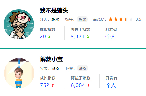 据手游那点事了解,《我不是猪头》以及《解救小宝》两款益智类产品的上线时间在一众上榜小游戏中并不算长。根据阿拉丁指数显示,《我不是猪头》首次录得指数时间在2月1号,而且当时游戏以接近9400的高数值直接空降阿拉丁榜单头部。