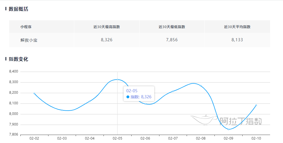 《解救小宝》首次录得指数时间在2月2号,当时游戏同样以超过8100的高数值直接空降阿拉丁榜单头部。随后游戏的指数表现同样在8300-8000出现了小幅的波动,整体上的热度相当不错,但是从趋势来看增长的“后劲”似乎略显不足,在8号-9号期间游戏的指数出现了明显的下滑,但是在10号再度出现了反弹。