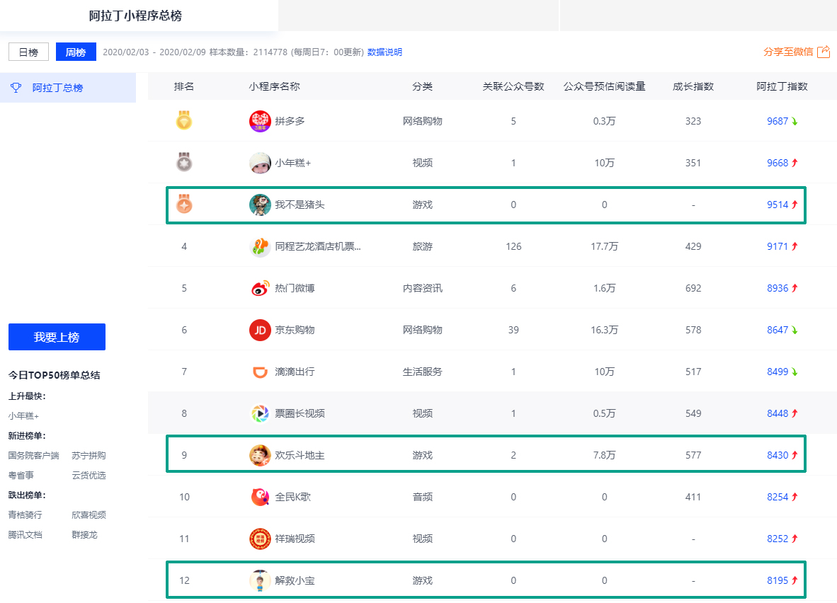 两周内共计9款小游戏打入小程序TOP50榜单,《我不是猪头》强势空降TOP3