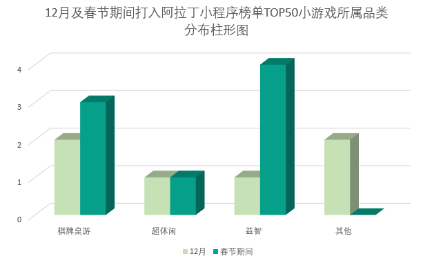 回顾春节之前的12月份,在阿拉丁指数发布的TOP100小程序榜单中,成功上榜的小游戏合共有18款,其中棋牌桌游类小游戏有3款,超休闲以及益智类各有4款,剩下其他品类的游戏则有6款;而打入TOP50的小游戏则是有6款,其中棋牌类有2款,益智类和超休闲类各有1款,其他品类的小游戏则有2款。
