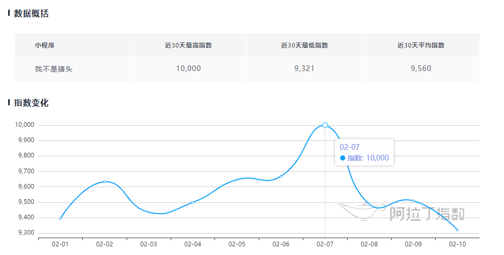 在2月1号至今,游戏指数的振幅在9400-10000之间,整体上保持较高水平,可见游戏近期在微信小游戏圈内的热度相当不错,截至目前游戏在阿拉丁指数上录得的最高指数为10000点,但游戏在后续几天的指数出现了持续的下滑。