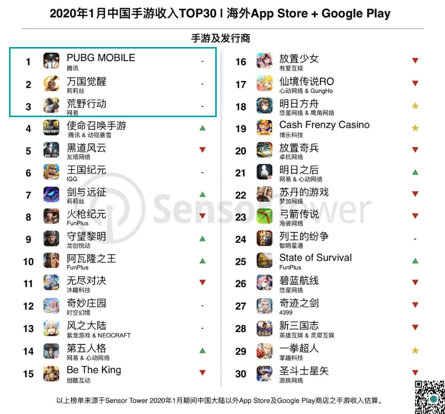 一、收入TOP3产品持续霸榜,《万国觉醒》《荒野行动》流水再创新高