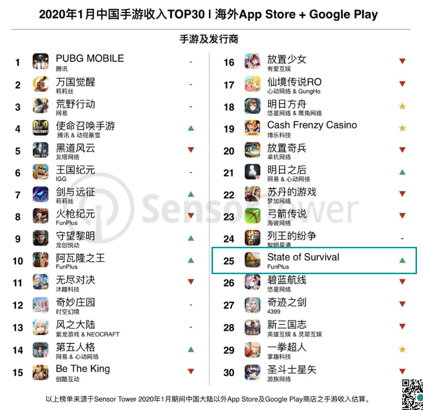 FunPlus的末日生存题材SLG《State of Survival》继去年12月打入出海收入榜后,游戏收入持续增长,1月份排名上升3位至第25名。SensorTower数据显示,游戏1月份收入环比增长27.2%。