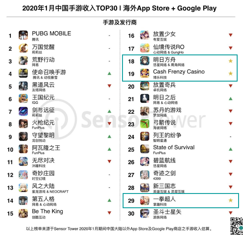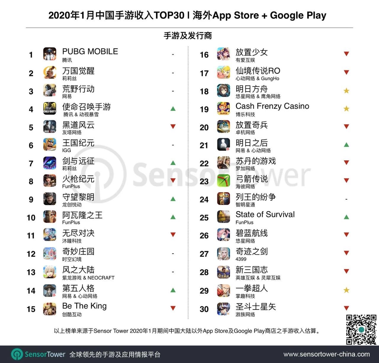 今天(2月14日),数据分析公司SensorTower发布了2020年1月中国游戏出海报告,报告揭示了1月中国手游在海外收入的TOP30。