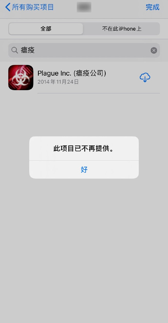 目前,我们在苹果App Store国区上已经搜索不到《瘟疫公司》。此前曾经下载过该游戏的玩家,虽然还能在已购项目里找到该应用,却也无法再下载了。