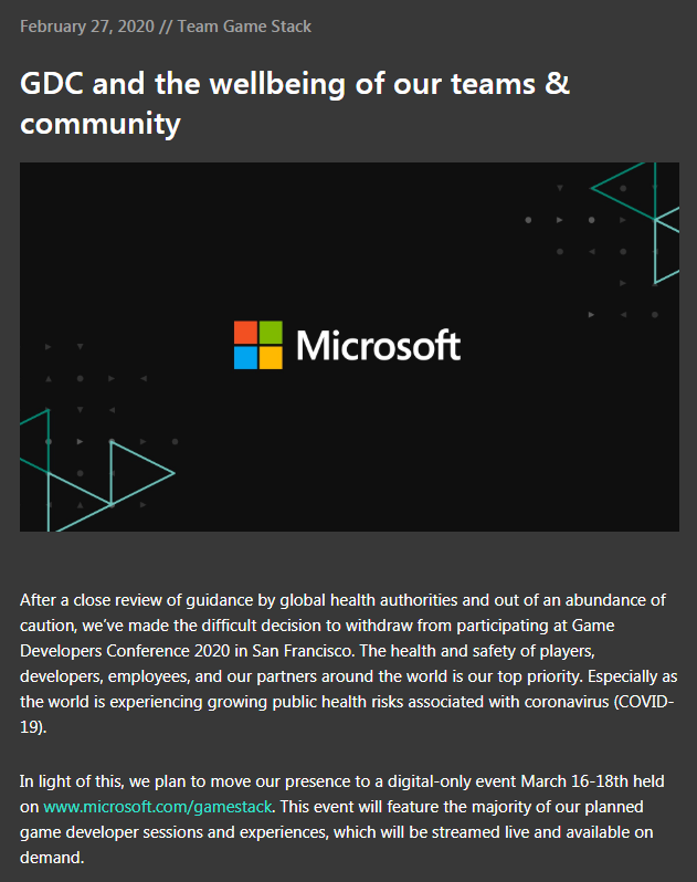 虽然近日国内的新冠肺炎防疫形势有所缓和,大家也逐渐走在了复工和正常工作生活的路上,但全球范围的防疫形势却依然严峻,而受到其影响,今天(北京时间2月28日),微软和Epic也终于宣布,将取消原计划于三月的GDC全球开发者大会展台,改为在线进行。自病毒爆发以来,全球范围内游戏产业的交流集会、主机产能、开发进度和电竞比赛等皆受到很大影响。