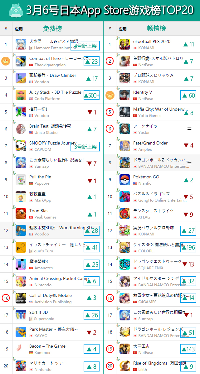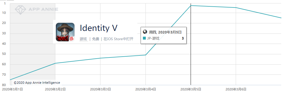 就和二次元类游戏排名变化的规律类似,在3月5号更新结束并开启了新活动之后,《第五人格》在日本畅销榜的排名应声而起,并且迅速冲上了TOP3的位置。