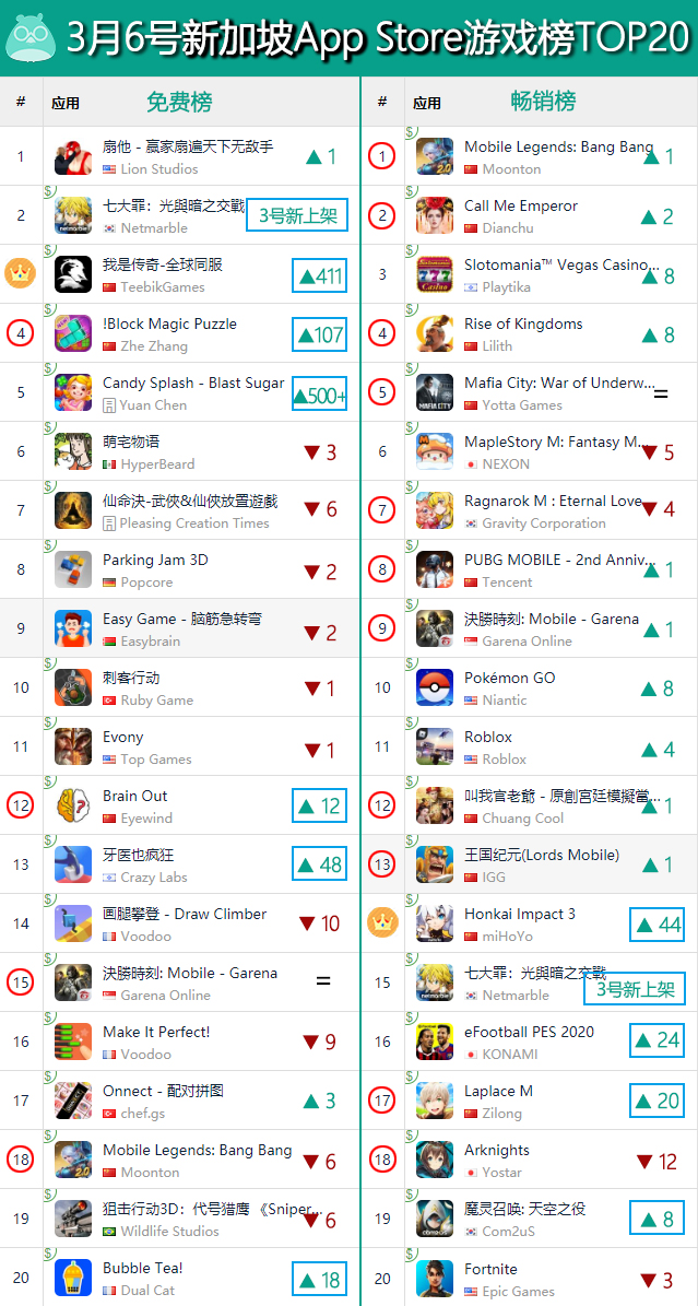 最后来到东南亚地区的代表:新加坡市场。来到3月份出海游戏在新加坡市场的表现仍然是一片火热:新加坡市场双榜TOP20中,出海游戏合共拿下了17个席位,而且也再度迎来了新面孔。