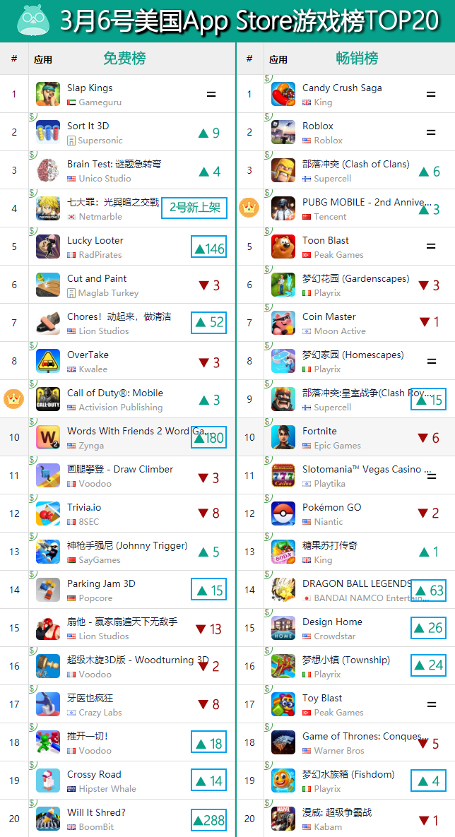 接下来又到美国市场了。正如文章开头提到的那样,本期出海游戏在美国市场仍然是维持“双雄”局面,成功打入美国双榜TOP20的就只有《使命召唤手游》以及《PUBG MOBILE》两款射击大作,咱就不再多啰嗦了。