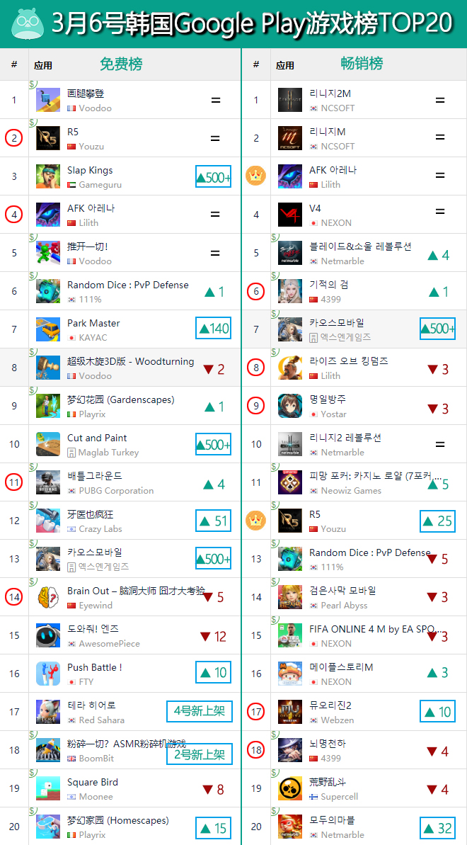 再来看看畅销榜方面,本期仅有《R5》一款产品是首度打入韩国畅销榜头部,其余的产品都是我们栏目的老熟人了,包括继续稳守TOP3的《剑与远征》,TOP6的《奇迹之剑》,TOP8的《万国觉醒》和TOP9的《明日方舟》;