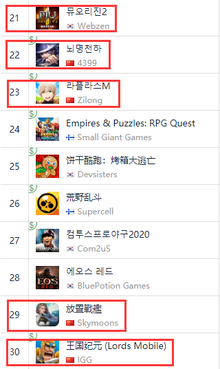 当我们把畅销榜下来到TOP30后,能明显发现在TOP21-30区段内再度出现了5款出海游戏的身影,之后出海游戏在韩国市场的表现仍然非常值得期待 。
