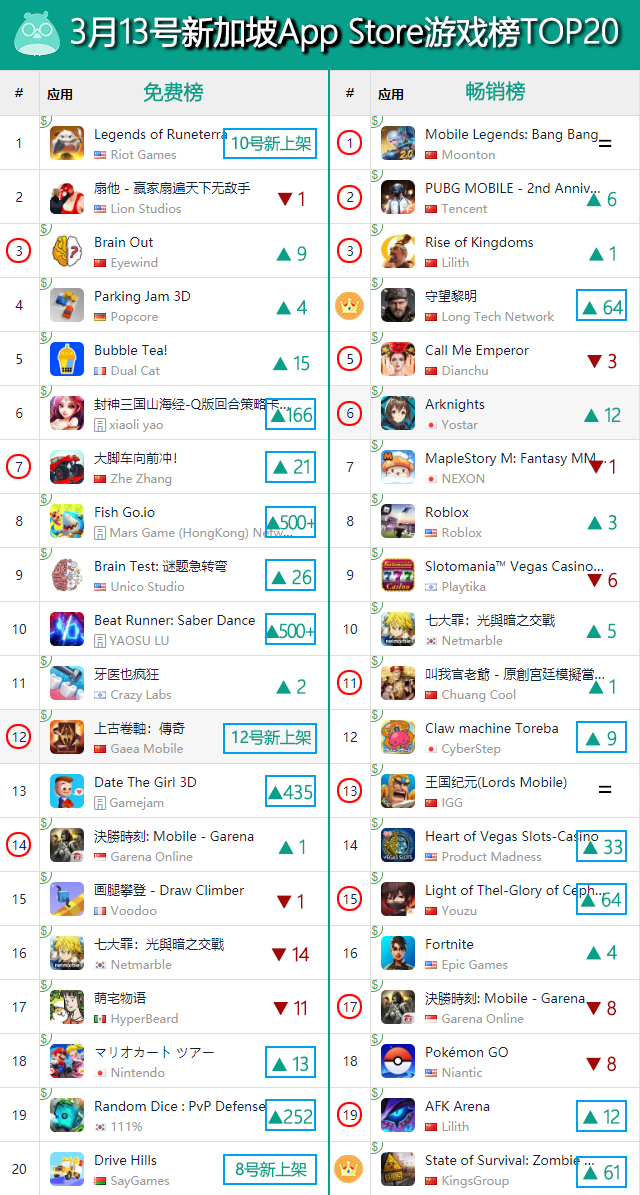 除了这两款新品外,《Brain Out》以及《使命召唤手游》也在本期继续稳守新加坡免费榜TOP3以及TOP14。