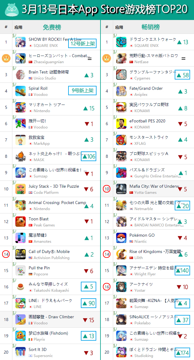 和早前的情况比较类似,在榜单上的其他蓝色框标识产品大多来自日本本土厂商,正所谓“此消彼长”,这样一来部分出海产品暂时跌出TOP20也在情理之中,过后可能又会再度有“惊喜”出现。