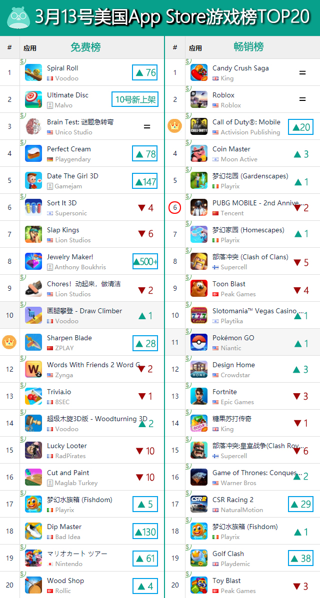 又来到美国市场,正如文章开头提到的那样,本期出海游戏在美国市场成功打破了“双雄”局面,除了《使命召唤手游》以及《PUBG MOBILE》两款射击大作外,还有一款新的超休闲产品打入了美国免费榜头部。