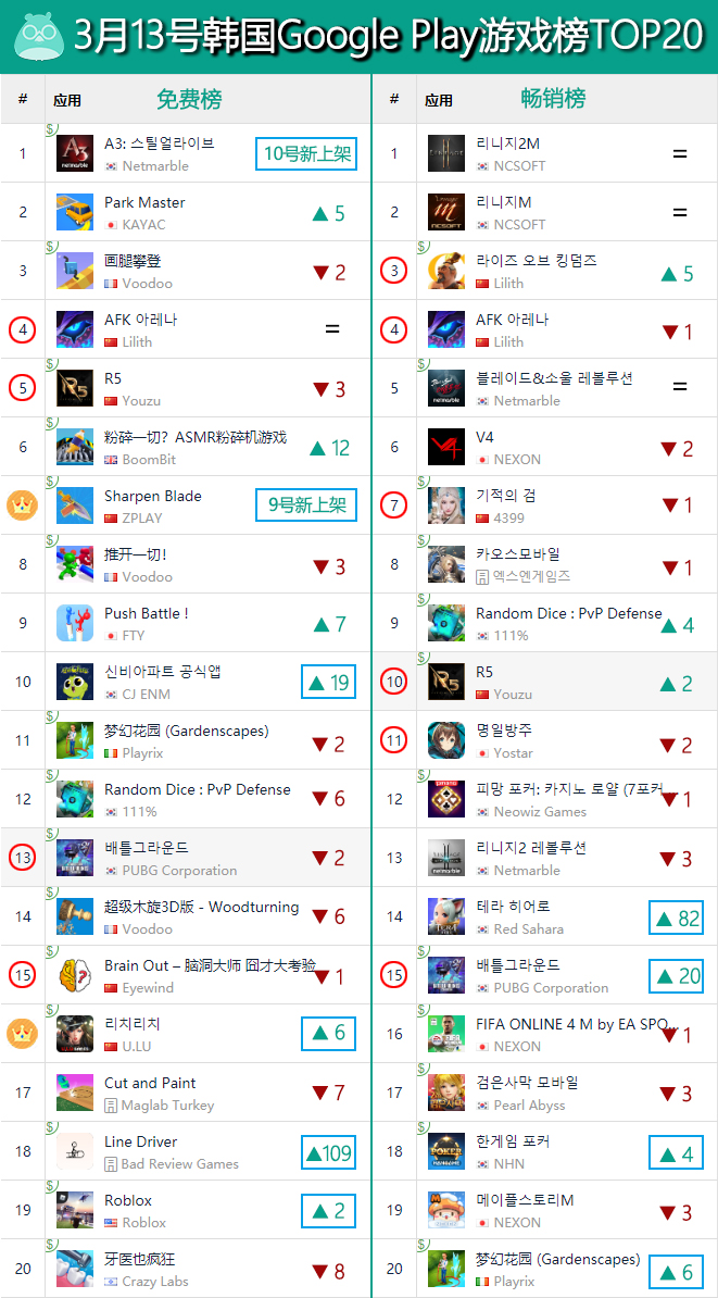除了这两款新品外,同时打入了韩国免费榜TOP20的还有咱们的4个老熟人,包括:TOP4的《剑与远征》、TOP5的《R5》、TOP13的《PUBG MOBILE》以及TOP15的《Brain Out》;