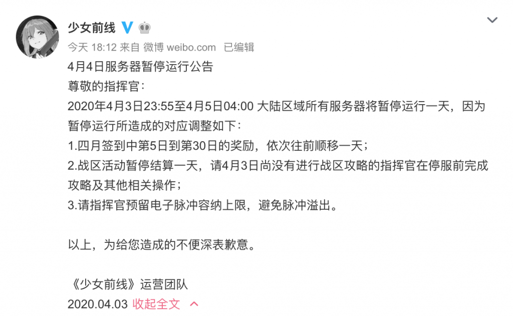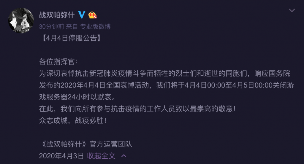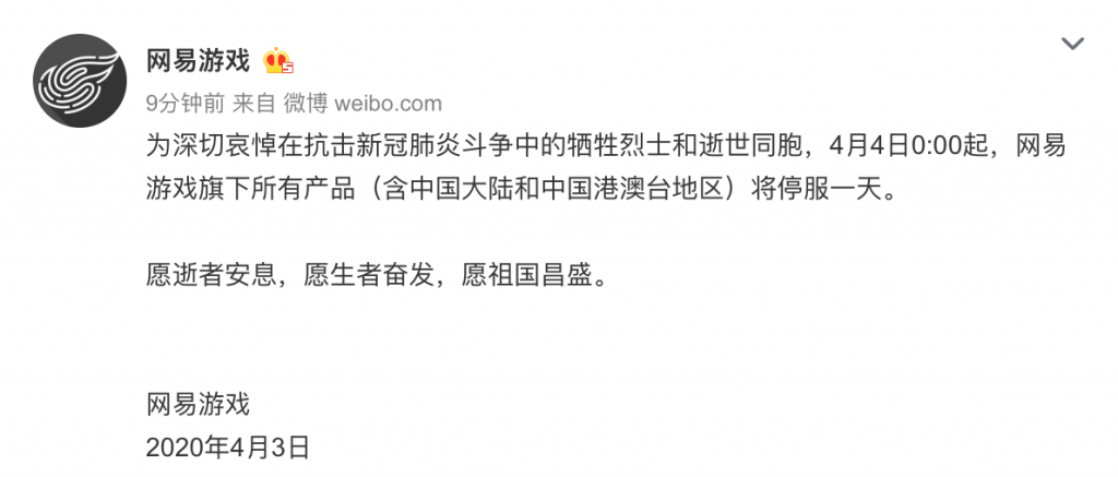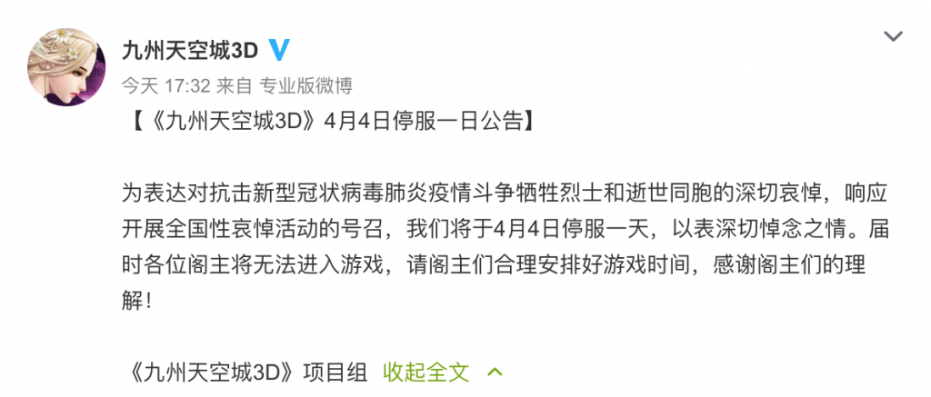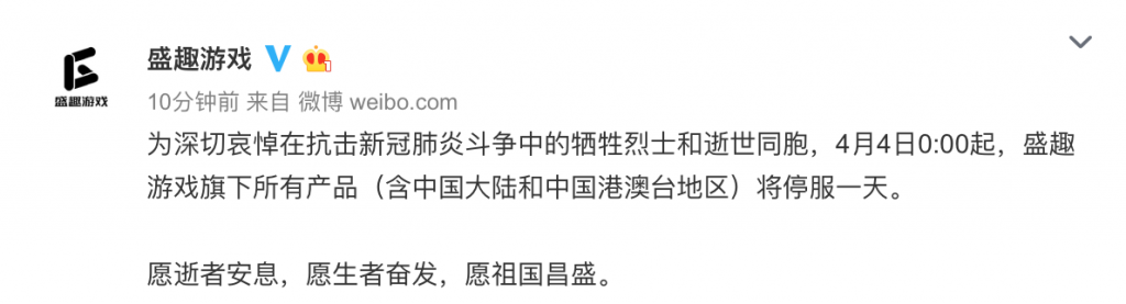 为深切哀悼在抗击新冠肺炎斗争中的牺牲烈士和逝世同胞,4月4日0:00起,盛趣游戏旗下所有产品(含中国大陆和中国港澳台区域)将停服一天。