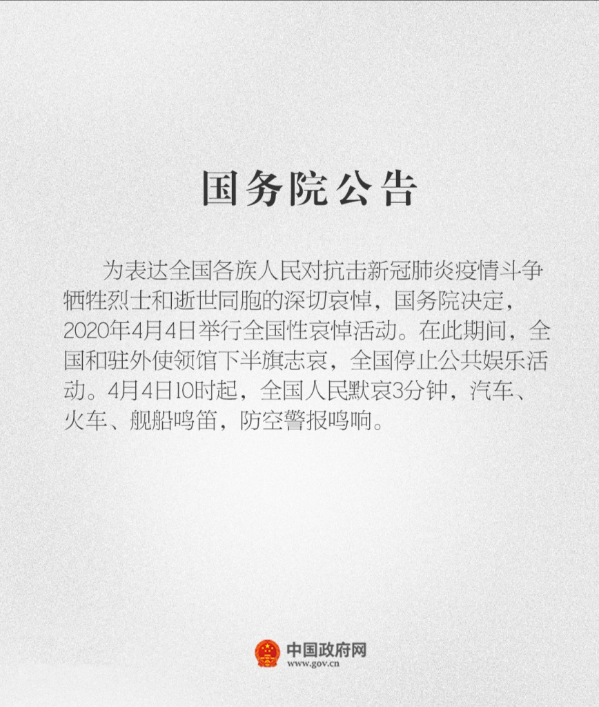 2020年4月3日,国务院办公厅下发关于为新冠肺炎疫情牺牲烈士和逝世同胞举行全国性哀悼活动的通知。通知中提到4月4日全国和驻外使领馆下半旗志哀,全国停止公共娱乐活动。