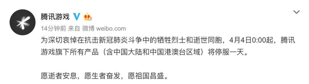 为深切哀悼在抗击新冠肺炎斗争中的牺牲烈士和逝世同胞,4月4日0:00起,腾讯游戏旗下所有产品(含中国大陆和中国港澳台区域)将停服一天。